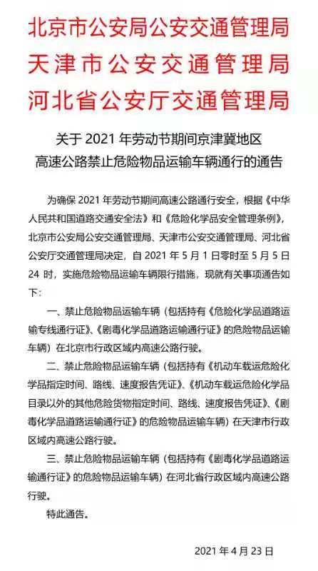 為確保2021年五一勞動(dòng)節(jié)期間高速公路通行安全,根據(jù)《中華人民共和國道路交通安全法》和《危險(xiǎn)化學(xué)品安全管理?xiàng)l例》,4月23日,北京市公安局公安交通管理局、天津市公安交通管理局、河北省公安廳交通管理局發(fā)布《關(guān)于2021年勞動(dòng)節(jié)期間京津冀地區(qū)高速公路禁止物品運(yùn)輸車輛通行的通告》,通告決定,自2021年5月1日零時(shí)至5月5日24時(shí),實(shí)施物品運(yùn)輸車輛限行措施。