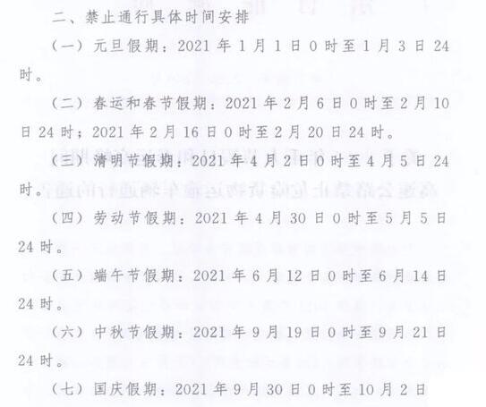 元旦節(jié)、春節(jié)、清明節(jié)、勞動(dòng)節(jié)、端午節(jié)、中秋節(jié)、國慶節(jié)假日期間,全天禁止物品運(yùn)輸車在高速公路通行;供應(yīng)自來水生產(chǎn)用的液氯運(yùn)輸車輛,燃油、天然氣運(yùn)輸車輛0時(shí)至6時(shí)禁止通行,其他時(shí)段不受限制。